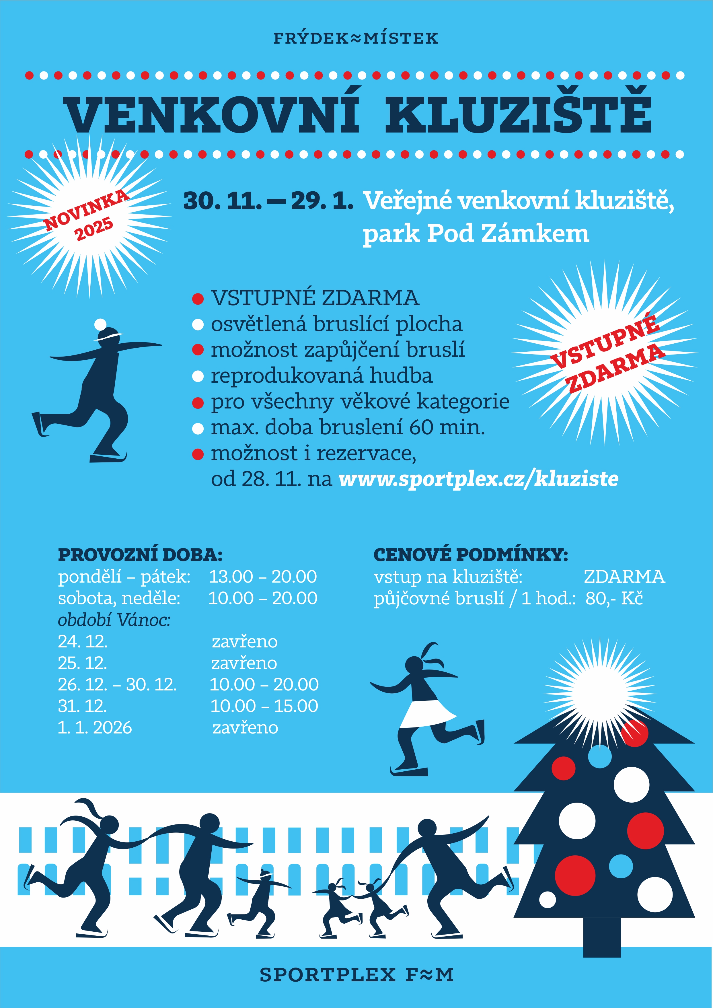 Kluziště bude v provozu až na výjimky denně do 20 hodin, a to až do 29. ledna 2026. Syntetický led zajistí stabilní povrch a provoz kluziště po celé zimní období bez ohledu na počasí.
